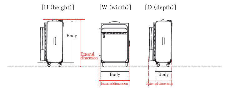 - External dimensions of luggage (suitcases and trolley bags) are indicated in the order of H (height) x W (width) x D (depth).