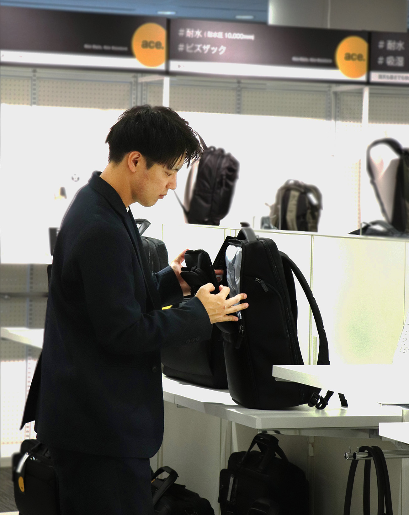 就職活動をする上では「モノづくり」に携わりたいと考えていて、普段身近に使っている鞄や靴、時計など生活に必要なモノを主軸にメーカー業界に興味を持っていました。エースは国内シェアNo.1且つ、スーツケースからカジュアルバック、ビジネスバックまで幅広い商品を扱っており、昔から変わらないモノづくりへのこだわりや誠実さに強く惹かれ、この会社で活躍したいと思い入社を決意しました。日常的に使うアイテムを多く取り扱っているからこそ耐久性や使い勝手を重視した商品や新しいデザインなどの製品開発に携わり、自身の創造性を発揮していきたいと思いました。