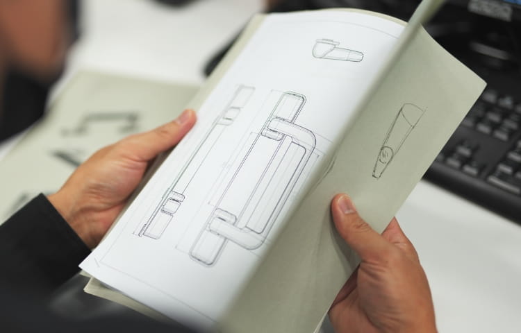 入社後はデザインセンターに配属され、現在までビジネスバッグやスーツケースのデザインに従事してきました。ace.やZERO HALLIBURTON、PROTECAなどの社内ブランドはもちろん、OEM提供する社外ブランドの新商品デザインを担当するほか、新たなブランドの立ち上げにも携わりました。エースでは、年に数回ある展示会に向けて営業やMD統括部が新たな商品ラインナップを企画します。この企画を受けてデザインを考案し、仕様書に落とし込むのが私たちの職務です