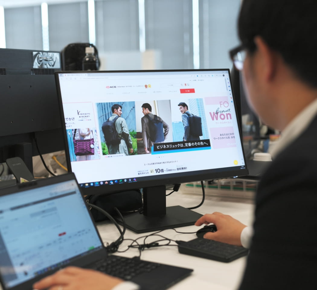 百貨店や専門店、量販店など、様々な得意先にエースの商品を卸しています。店舗の立地や主な客層、競合他社の出店状況などを見極め、各店ごとの最適な営業プランを考案。売場のメンテナンスなど、お客様に購入いただくための施策も行います。エースでは各販売チャネルで担当が分かれ、それぞれ主力ブランドもアプローチの仕方も異なります。市場のニーズを把握し、幅広い商品知識とノウハウで、エースファンを増やすことが使命です。