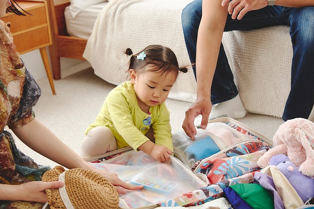 明るい笑顔が素敵なご家族。リサーチ上手な剛さんがいつも魅力的な旅行先を提案することが多いそう。荷物が増えがちな家族旅行。お子様アイテムも含めて1 つのスーツケースにパッキングしていただきました!