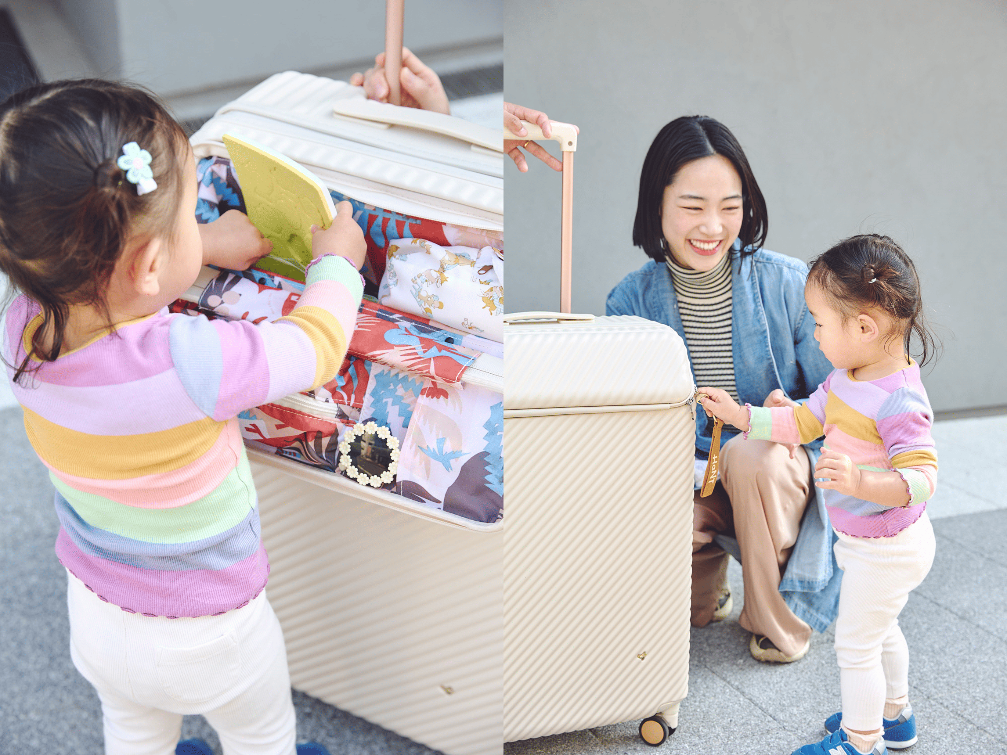 子供と旅するスーツケース ヘイヘイをチョイス!ひと目で中身が分かる「見えるポケット」や、「ひとりでできるもんパック」など、家族旅行に最適な機能が盛りだくさん。
