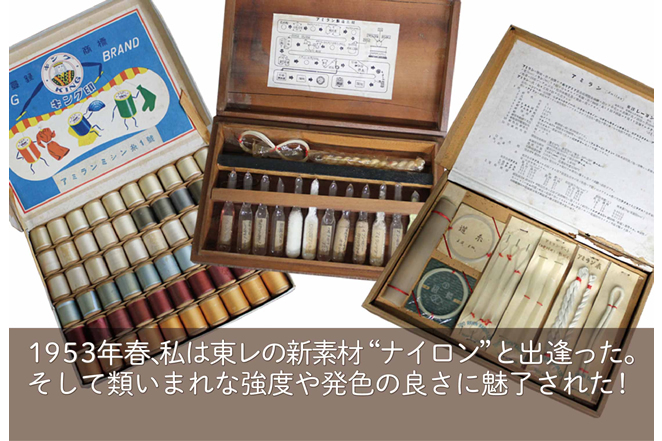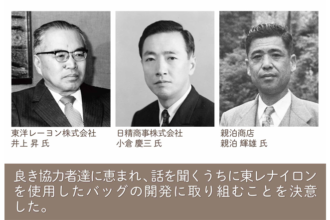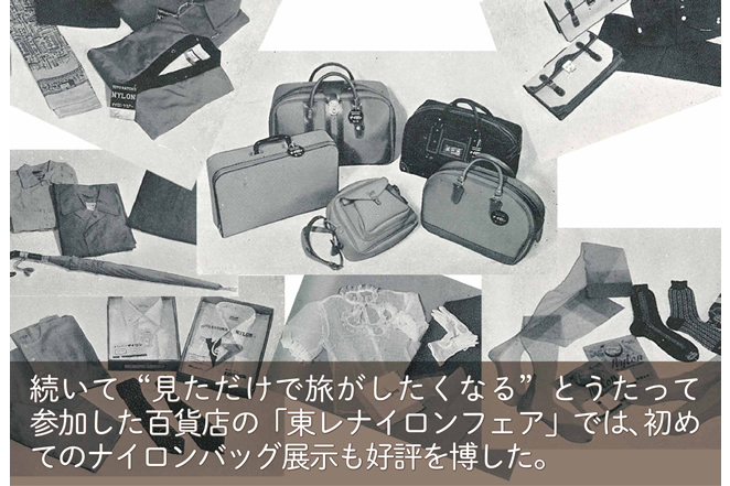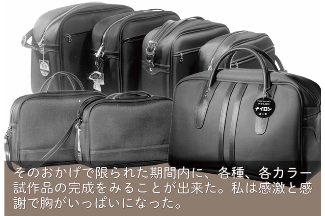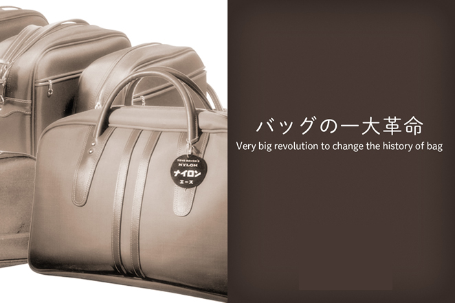 1953年 東洋レーヨンナイロンエースバッグ 発売 日本初のナイロンバッグ誕生 当時ナイロンはまだ一般には知られていない未知の素材。 柳作はそのナイロン素材を使ったバッグの開発に心血を注ぎ、1953年、ついに日本初のナイロンバッグを世に送り出した。 このことはカバン史上「一大革命」とも云われ、多方面に大きな影響を与えた。 〈 歴史年表