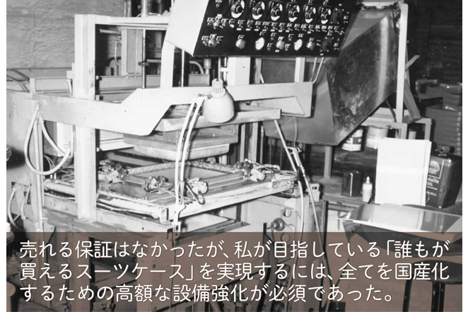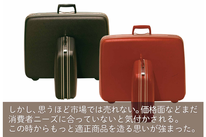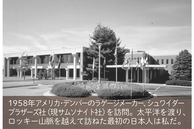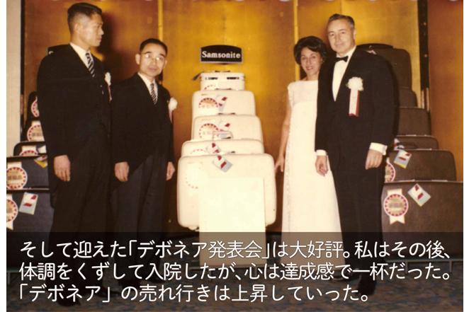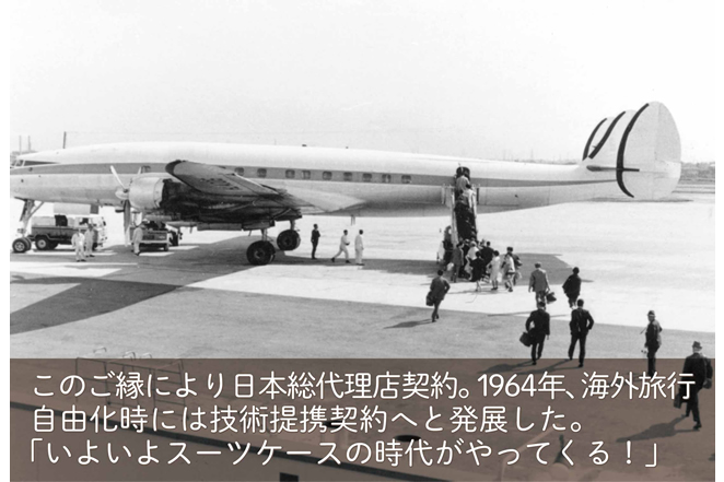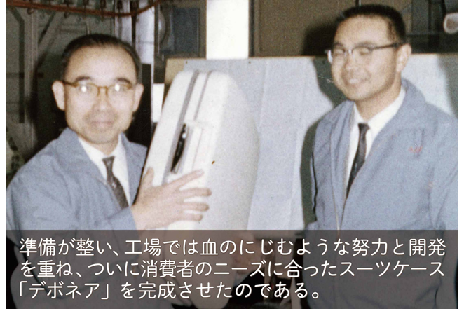 国産スーツケース「デボネア」が完成 待望の国産スーツケースが完成 米国での市場調査を機に、ラゲージメーカーシュワイダーブラザーズ社(現・サムソナイト社)と技術提携契約を結んだ。 しかし当時の日本ではスーツケースは高嶺の花。 だが飛行機時代の到来を信ずる柳作は、莫大な投資をして生産工場を建設し、日本市場に見合った国産のスーツケース「デボネア」を完成させた。 〈 歴史年表
